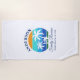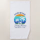 Family Reunion Summer Beach Palm Trees Sun Retro Style White Beach Towel. Great for family reunion vacations from camping on the beach to a boat cruise. Personalise with your family name, location, year or date and more. White with Navy Blue Text or choose your colour.