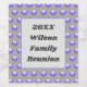 Create a memorable addition to your family reunion table or a treasured keepsake with these vibrant wine bottle labels. The pattern features a vivid blue polka dot pattern against a dark grey background. The centre features a blue grey rectangle to provide the background for your family name and year.