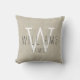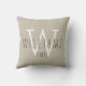 Family! Personalised home decor pillow. Personalised beige, black and white monogrammed pillow with family last name in typography font overlay design on a PRINTED beige linen photo effect background. Elke Clarke© Makes a great gift for newly weds or for your family. Great trendy, elegant accessory for your bedroom, favourite chair, as fun home decor in your family room or formal decorative addition to your living room. Customise with your names, monogram initial and wedding date.