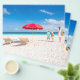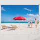 Two chairs under umbrella on a beautiful tropical beach with family walking nearby