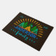 This personalised doormat is perfect for a family who loves camping and the outdoors. It has a sun ray motif in orange above a scene that includes pine trees, a tent and four stick figures peeking out from behind the tent or roasting hot dogs over a fire.