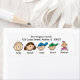 Customisable stick figure family address labels featuring a dad with light brown hair, mum with brown hair, a boy with a blue baseball cap, boy with a green baseball cap, and a baby girl! You can customise this item with names and an address!