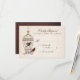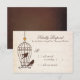 These wedding response cards feature a fanciful birdcage with swirls and an orange heart, and two cute birds, in chocolate brown, hanging against an ivory, textured paper background with faded handwriting. The wording, in alternating script and classic serif fonts, is completely customisable.