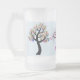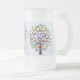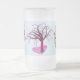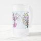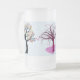 Three fanciful trees: one with colourful butterflies, one with bright multi coloured leaves and the centre one with just a few burgundy coloured hearts, all on a frosty blue background envelope a very nice large frosted mug.
