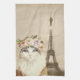 Fun kitchen towel for cat lovers features vintage sepia tint background photo of the Eiffel Tower with overlay of beautiful fancy cat with floral crown.