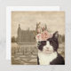 Vintage sepia tint background photo of a castle with manicured gardens and overlay of beautiful fancy black and white cat with floral crown