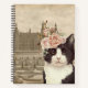 Vintage sepia tint background photo of a castle with manicured gardens and overlay of beautiful fancy black and white cat with floral crown