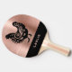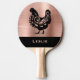 This ping pong paddle has a vintage farmhouse chicken motif that's all gussied up in a black filagree with fancy cut-out swirls. It's set against a copper like rose gold background -- it isn't actually metal but just has faux metallic effects in a rose gold color. Your monogram name appears in a coordinating typeface on a black color block below. This design is similar to folk art or country farmhouse retro artwork and knickknacks and adds some country style to your game. These paddles would be great for a rural community center, country cabin, vacation rental house, or gift.