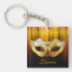 Fancy Classic Masquerade Part Favour Key chain. Features a gold and black elegant background with a very ornate and fancy masquerade mask on top with flourishes adorning it. A great party or wedding favour.