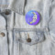 This round pin back button has a fancy white crescent moon with a face that has blue eyes and pink lips and brightly coloured abstract shapes in purple, blue, and yellow.