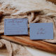 A simple and elegant calligraphy wedding RSVP card. That has a blue background and deep red burgundy hand drawn frame and info.