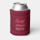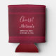 Birthday / event can cooler with a red background decorated with elegant swirls and ornamental designs along the borders.