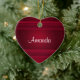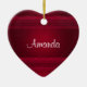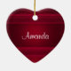 An ornament with a red background decorated with elegant swirls and ornamental designs along the borders.