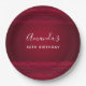 Birthday paper plates with a red background decorated with elegant swirls and ornamental designs along the borders.