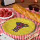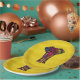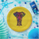 paper plates with an elephant illustration with bright and bold colours with decorative floral and mandela style pattern. The background is a stripedvintage style design in a warm yellow colour.