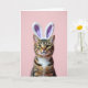 This design shows a striped tabby cat centered on a soft pastel pink background, dressed in fuzzy white bunny ears with pale lavender inner lining 🐰. The cat’s rich brown-and-black fur pattern is shown in crisp detail, and its golden eyes meet yours with a tender, almost teasing look that feels like a quiet inside joke between close friends. Gentle lighting smooths the scene and brings out the plush texture of the ears, the small pink nose, and the fine whiskers fanning from its muzzle. Near the top, a short Easter greeting sits in simple lettering, set in a light lavender color that echoes the ear lining 🌷. A smaller line of text is placed near the bottom in soft gray, leaving plenty of open space around the portrait. The background stays uncluttered, keeping attention on the cat’s face and the cozy costume details. The bunny ears sit slightly tilted, with the white fur catching a soft highlight along the edges.