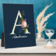 Beautiful and fancy florals include gold leaves, purple rose and blue wildflowers embellishments on large light colored letter / initial A. Dark blue background. Customize with first / last name