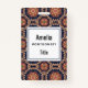 Name badge with a repeating pattern of decorative ornate elements in flower, star and sun shapes.