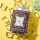 Can cooler with a repeating pattern of decorative ornate elements in flower, star and sun shapes.