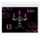 This is a note card decorated as a wedding table number card. This features my drawing of an elegant gothic candle holder in black and grey with bat wings, swirls, and hot pink drippy candles and pink jewels on black. This card is decorated inside and out in case you want to fold these inside out or not so you will want to change the table number on front, back, and inside. Please note that the inside is not glossy so if you decide to fold these inside out, they wont be as glossy as the outside of the card.