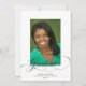 A simple but elegant graduation announcement featuring a photo of the graduate overlaid with the word "graduate" in black elegant cursive script, and graduation details underneath. The background is in white, and the reverse is in black.