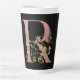 Fancy pink glitter letter R with gold leaves and swirls overlay and a coppery butterfly on black background.