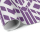 Stylish wrapping paper features a fancy purple and grey geometric pattern of stripes and diamonds. Some of the diamonds surround clusters of three bold purple stripes as if they are holding them. Columns of purple diamonds with bold light grey outlines separate the trios of stripes. Grey pinstripes further divide the design into sections.