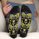 This pair of socks features an old-school style decorative pattern, set in gold against a black background, for a truly unique look.