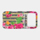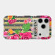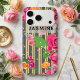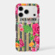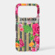 Fancy floral personalized iPhone case design featuring roses on a gold and black vertical striped background. The text is fully customizable.