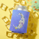 This can or bottle cooler has a fancy white crescent moon with a smiling face with colourful abstract shapes including circles, triangles, and a scroll in blue yellow, and purple on a purple sky background with dotted stars.