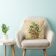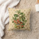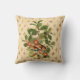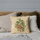 Pretty throw pillow features vintage woodland botanical illustration of mushrooms, flowers and a variety of leaves on a creamy peach and gold harlequin background.