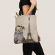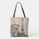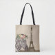 Stylish and eclectic tote bag features vintage sepia tint background photo of the Eiffel Tower with overlay of beautiful watercolor zebra portrait with floral crown
