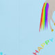 The unicorn is accompanied by a pair of fluffy white clouds with rainbow coloured text in between that says "Happy Birthday".