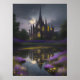 This enchanting fantasy landscape captures a majestic gothic cathedral bathed in moonlight, with warm golden windows glowing against the twilight sky. Surrounded by vibrant purple lavender fields and reflected perfectly in tranquil waters, this dreamy scene creates a magical atmosphere that's both mysterious and inviting. Ideal for fantasy lovers, dreamers, and anyone who wants to bring a touch of ethereal beauty to their space.