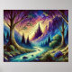This vibrant stained glass–style design captures a magical landscape with a glowing castle rising between violet mountains at sunset. A winding river shimmers in shades of blue, framed by tall evergreens and graceful trees arching overhead. The rich palette of purples, golds, and emerald greens creates an enchanting, dreamlike atmosphere, evoking a sense of wonder and fantasy.