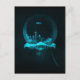 A giant snowglobe contains a metropolitan cityscape with a flying blimp above. The globe sits on an icy pedestal with wires coming out and fading into the darkness. Cool fantasy design in black and turquoise blue. The setting has a icy yet tranquil feel.