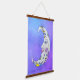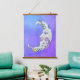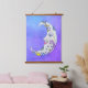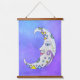 This tapestry with wood hangers has a fantasy white crescent moon with a face and is decorated with abstract shapes in blue, yellow, and purple against a purple and blue sky with dotted stars.