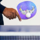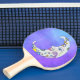 This ping pong paddle has a white fantasy crescent moon with a face with abstract markings in blue, yellow, and purple on a purple sky background with white stars.