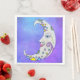 This paper napkin has a fantasy white crescent moon with a pretty face and decorated with colourful abstract shapes of blue and yellow triangles and circles, purple scroll, and yellow stars on a star dotted purple sky background.