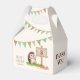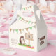 Adorable kid's birthday thank you gift favour box featuring a cute cheerful hedgehog, green grass and colourful mushroom on the floor, party flag and a wooden board with the number.
