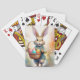 Playing cards with a cheerful rabbit in a blue outfit carrying a basket filled with colourful, decorated eggs. The background features soft floral details and gentle, warm colours.