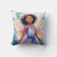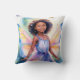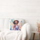 Throw pillow with a joyful child fairy with colourful butterfly wings standing in a flowing purple dress, surrounded by butterflies and soft, dreamy colours. The scene conveys a sense of whimsy and magic in a vibrant, nature-inspired setting.
