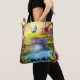 This tote bag features a fantasy forest with a waterfall, butterfly, birds and fairy houses.