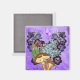 Beautiful fantasy garden of flowers, a toadstool mushroom, butterflies and dragonflies on a purple watercolor wash background.