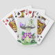 Playing cards with a small fairy with green wings sitting atop a large, spotted mushroom, accompanied by a purple butterfly. Below, vibrant purple flowers and lush green leaves add colour to the whimsical scene.