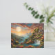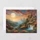 A full moon rises as the sun sets over a fantastic landscape on this post card. A manor house on a cliff above a beautiful waterfall that pours into a river that flows into a sea, as trees and flowers bloom all around.