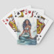 Playing cards with a mermaid with long, flowing hair sitting gracefully atop a rock surrounded by calm ocean waves. Towering rock formations loom in the misty background, creating a serene and mystical atmosphere.