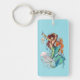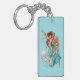 An auburn-haired mermaid with a teal tail, gracefully poised against a light blue backdrop. Surrounding her are blue water bubbles In front of her, a jellyfish in light pink and white, while a large orange seahorse floats beside her, adding a splash of vibrant contrast. From her outstretched right hand, seashells and a pearl necklace tumble downward. Adorned with shimmering gold bracelets