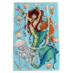 An auburn-haired mermaid with a teal tail, gracefully poised against a light blue backdrop. Surrounding her are blue water bubbles In front of her, a jellyfish in light pink and white, while a large orange seahorse floats beside her, adding a splash of vibrant contrast. From her outstretched right hand, seashells and a pearl necklace tumble downward. Adorned with shimmering gold bracelets