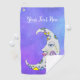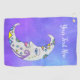 This golf towel has a fantasy white crescent moon with colourful markings in purple, yellow, and blue in abstract shapes and a pretty face on a mixed purple and blue night sky background. Customise your text with the template.